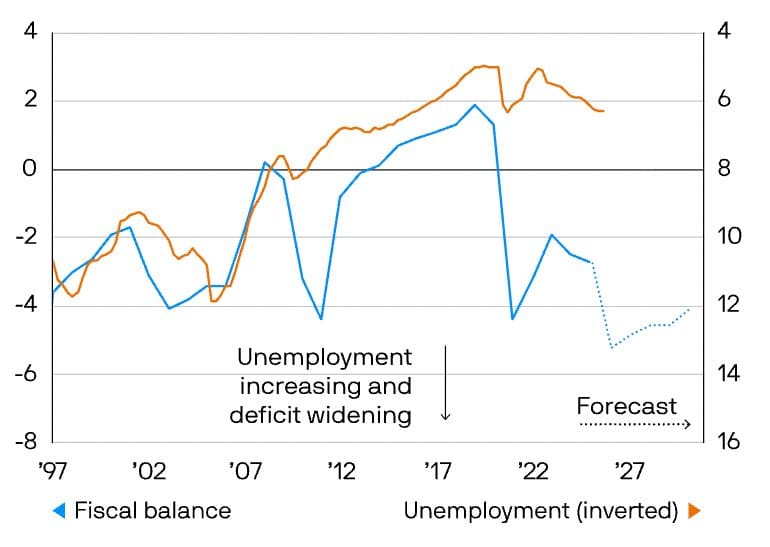 Source: Bloomberg, CBO, J.P. Morgan Asset Management. The fiscal balance forecast is based on the CBO’s latest budget and economic outlook. Data as of 31 October 2025.