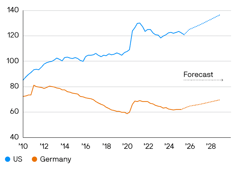 Source: Bank for International Settlements, BEA, Eurostat, IMF, LSEG Datastream, J.P. Morgan Asset Management. Debt refers to gross debt at face value. Dotted lines represent IMF forecasts. Data as of 31 October 2025.