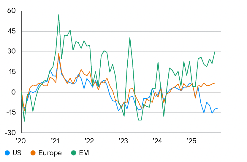 Activity should also meaningfully accelerate in continental Europe in 2026. The enormous fiscal stimulus announced in Germany in 2025 will start to feed through into economic data. This spending covers a very wide range of potential projects, from defence to transport infrastructure and industrial support measures. The investment-focused nature of Germany’s plans should aid manufacturing activity and broader growth.