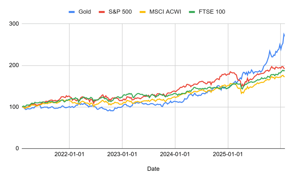 Gold, S&P 500, FTSE 100 and MSCI ACWI 5-year performance