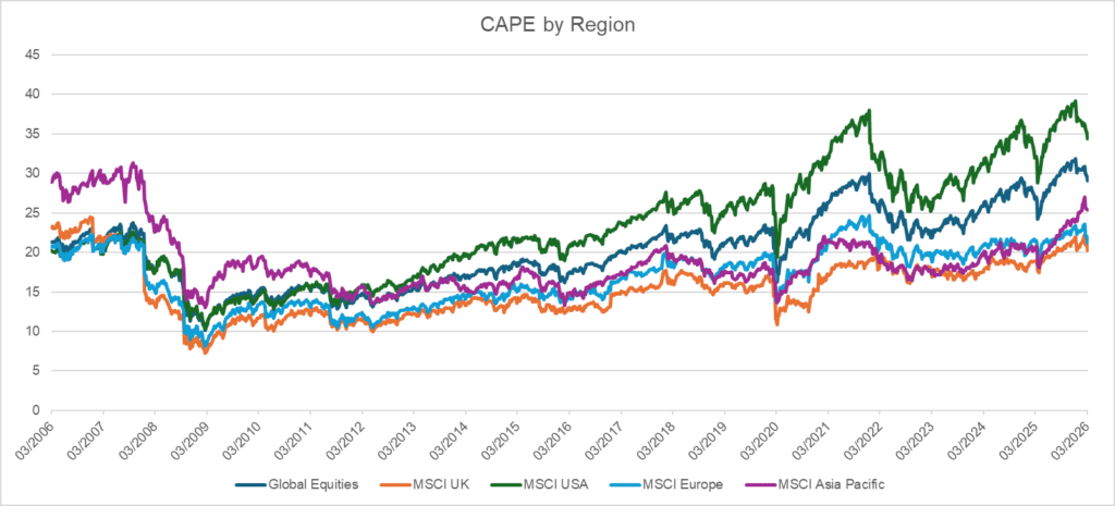 The United States’ CAPE reading at just under 35 comes much higher than the UK and Europe, and is a large contributor to the global equities’ CAPE at 29.